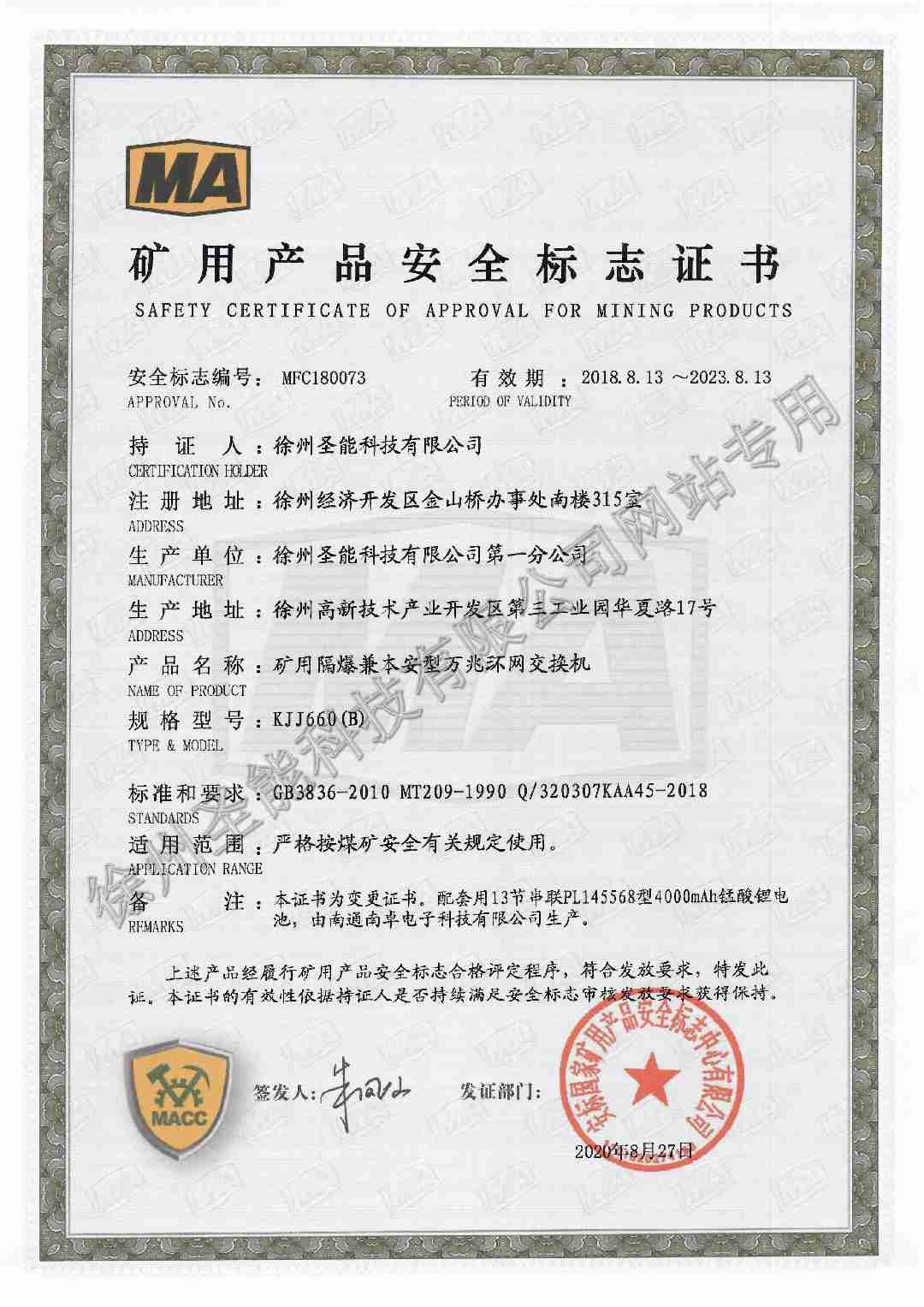 KJJ660(B)礦用隔爆兼本安型萬兆環(huán)網(wǎng)交換機(jī)防爆證