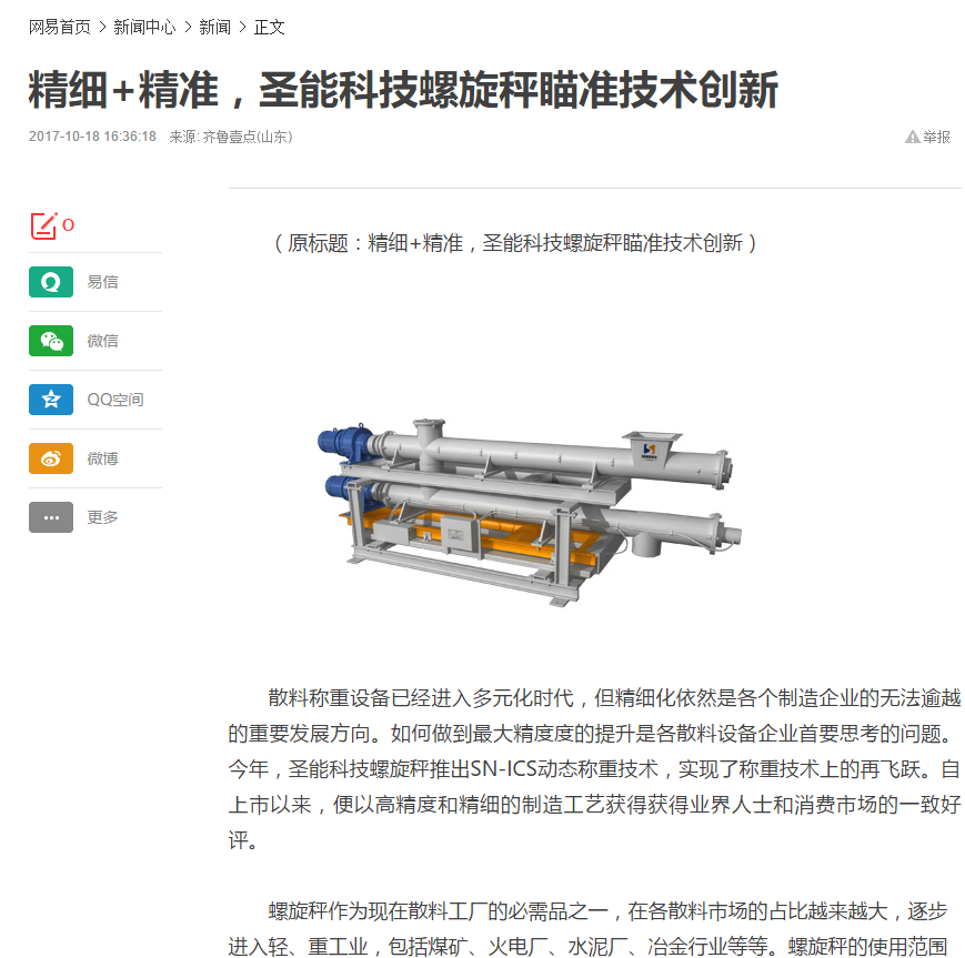 網(wǎng)易新聞報(bào)道:精細(xì)+精準(zhǔn),圣能科技螺旋秤瞄準(zhǔn)技術(shù)創(chuàng)新