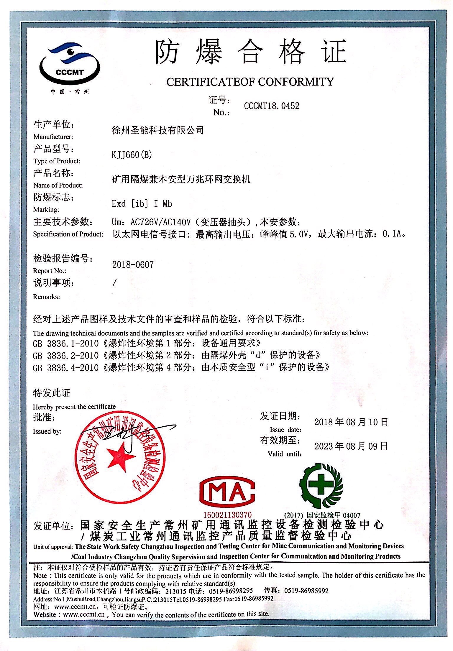 KJJ660(A)_MA礦用產(chǎn)品安全標志證書