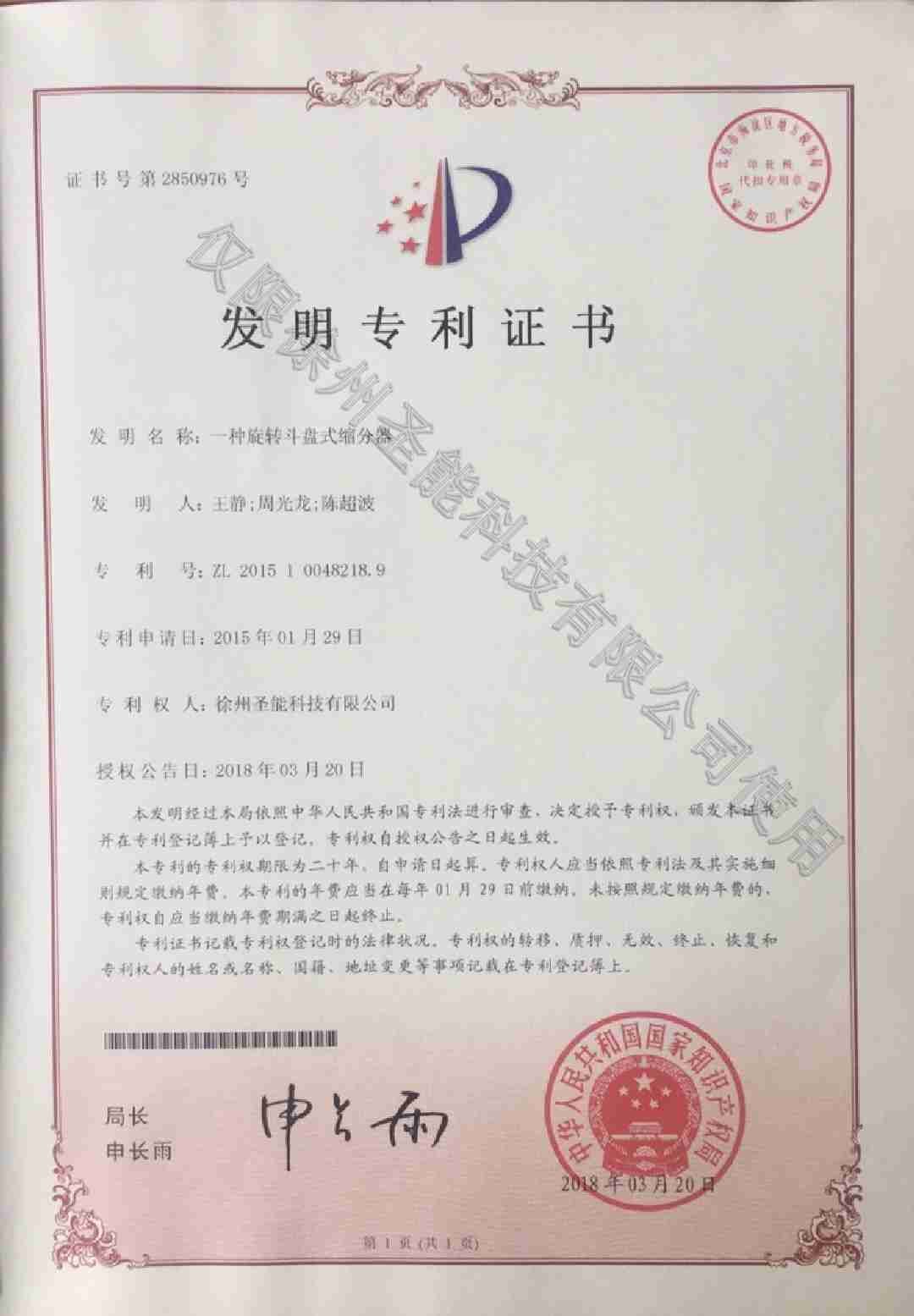 旋轉(zhuǎn)斗盤式縮分器發(fā)明專利證書