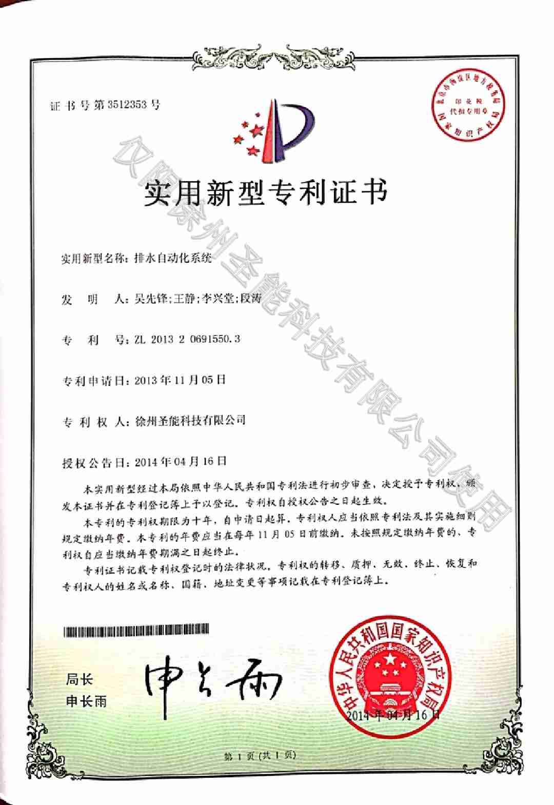 排水自動(dòng)化系統(tǒng)專利證書