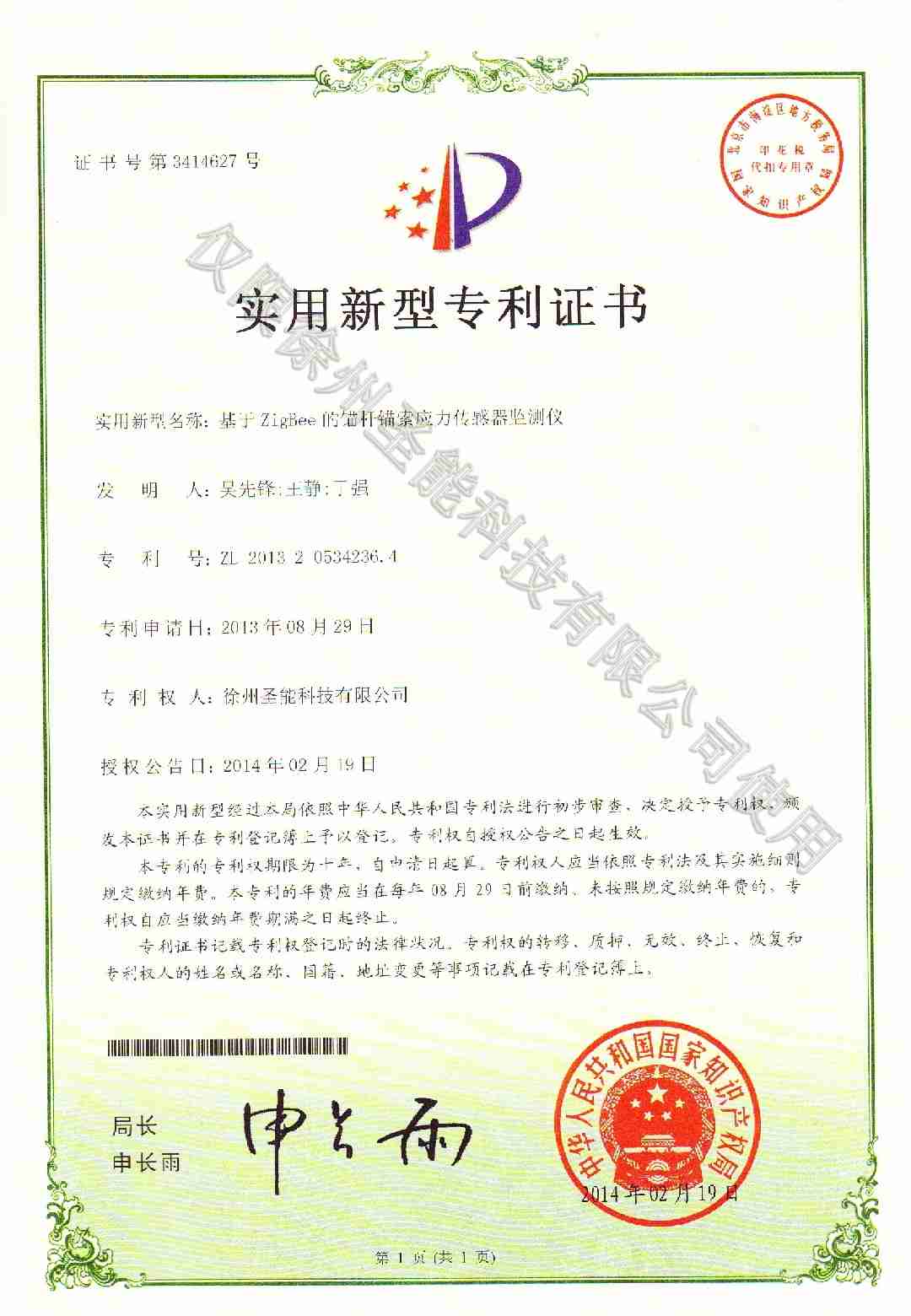 錨桿錨索應(yīng)力傳感監(jiān)測儀專利證書