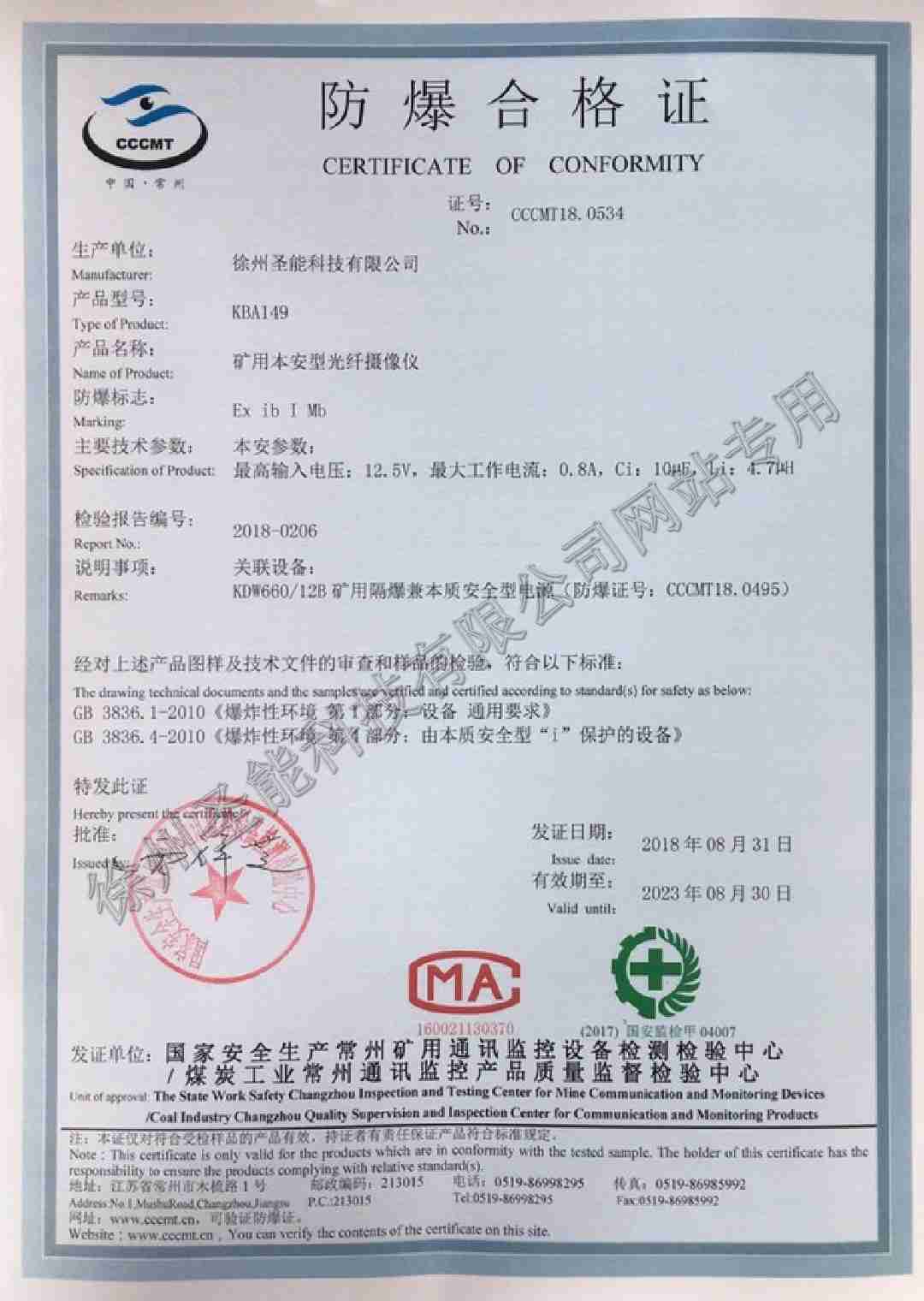 KBA149礦用本安型光纖攝像儀煤安證