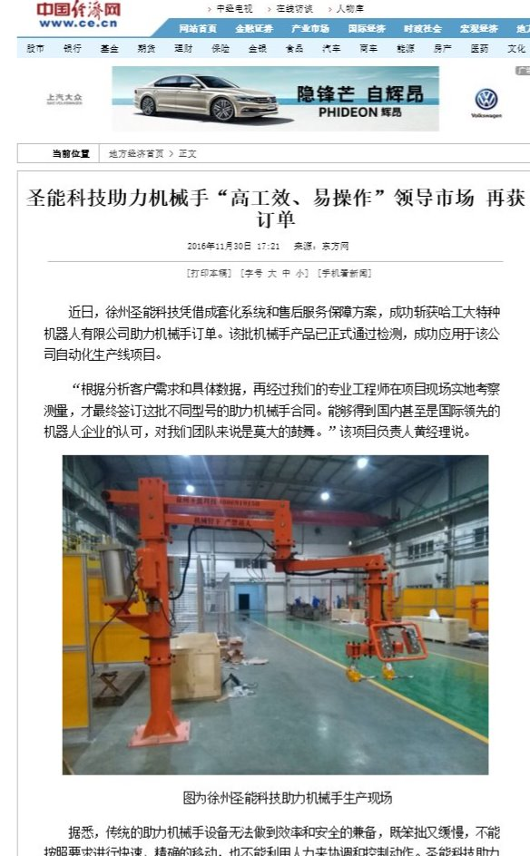 中國經(jīng)濟(jì)網(wǎng)報(bào)道:《圣能科技助力機(jī)械手“高工效、易操作”領(lǐng)導(dǎo)市場 再獲訂單》