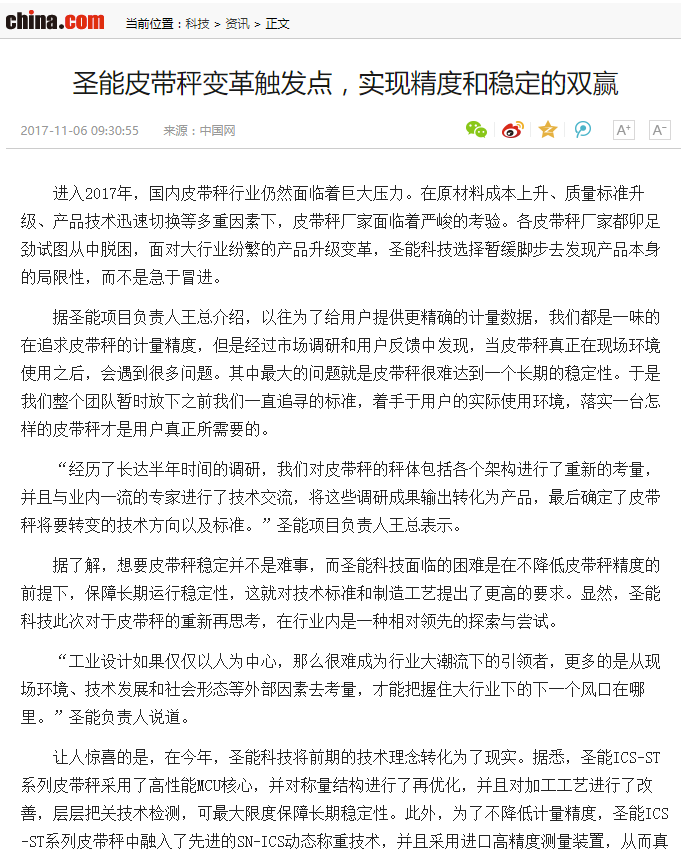 讓人驚喜的是,在今年,圣能科技將前期的技術(shù)理念轉(zhuǎn)化為了現(xiàn)實(shí)。據(jù)悉,圣能ICS-ST系列皮帶秤采用了高性能MCU核心,并對(duì)稱量結(jié)構(gòu)進(jìn)行了再優(yōu)化,并且對(duì)加工工藝進(jìn)行了改善,層層把關(guān)技術(shù)檢測(cè),可最大限度保障長(zhǎng)期穩(wěn)定性。此外,為了不降低計(jì)量精度,圣能ICS-ST系列皮帶秤中融入了先進(jìn)的SN-ICS動(dòng)態(tài)稱重技術(shù),并且采用進(jìn)口高精度測(cè)量裝置,從而真正實(shí)現(xiàn)了皮帶秤精度和穩(wěn)定的雙贏。