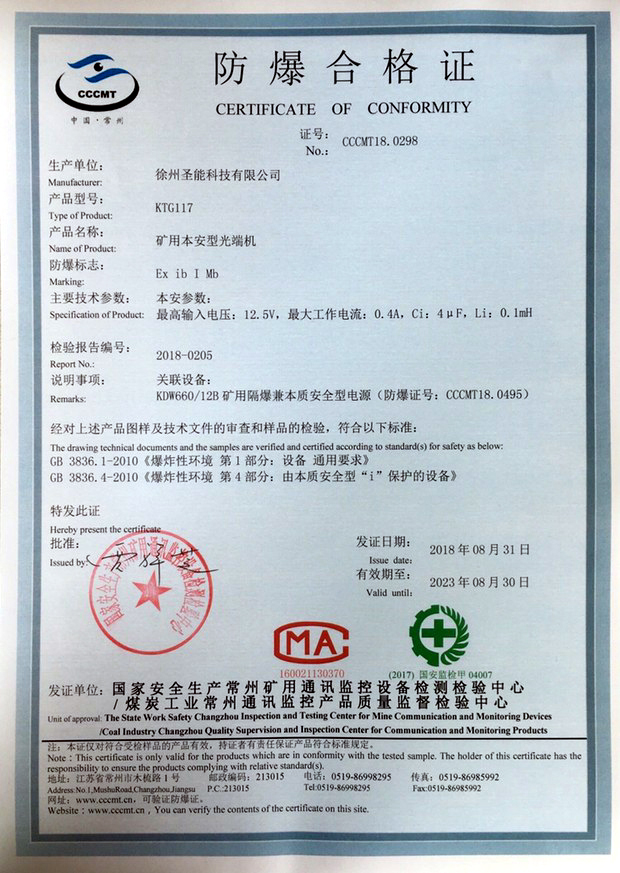 | KTG117(A) | 礦用本安型光端機(jī) | Exib?I | 直流DC12V | ≤800mA | BNC接口,同軸電纜模式 | 1 | 1 | 1 | 338mm?×295mm×105mm | 約4.8kg |