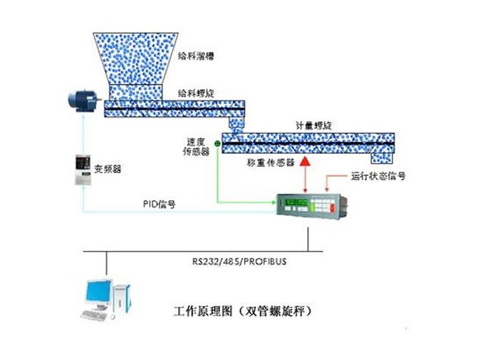 物料由進料口經(jīng)螺旋輸送機輸送到下面連接的計量絞刀,并通過安裝在計量絞刀上的三只拉力傳感器把計量螺旋完全稱重的重量以正比于稱重載荷的電壓信號送入控制器,和預(yù)設(shè)的絞刀速度數(shù)據(jù)一起(雙管計量時,計量絞刀恒速運轉(zhuǎn)向前推進物料,即速度信號為計量絞刀的設(shè)計值)。